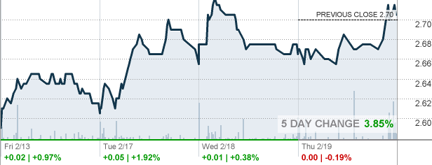 | 3.03 BATS BZX Real-Time Price As of 1:51pm ET | +0.035 / +1.17%Today’s Change | 2.96 Today|||52-Week Range 10.94 | -22.83% Year-to-Date |